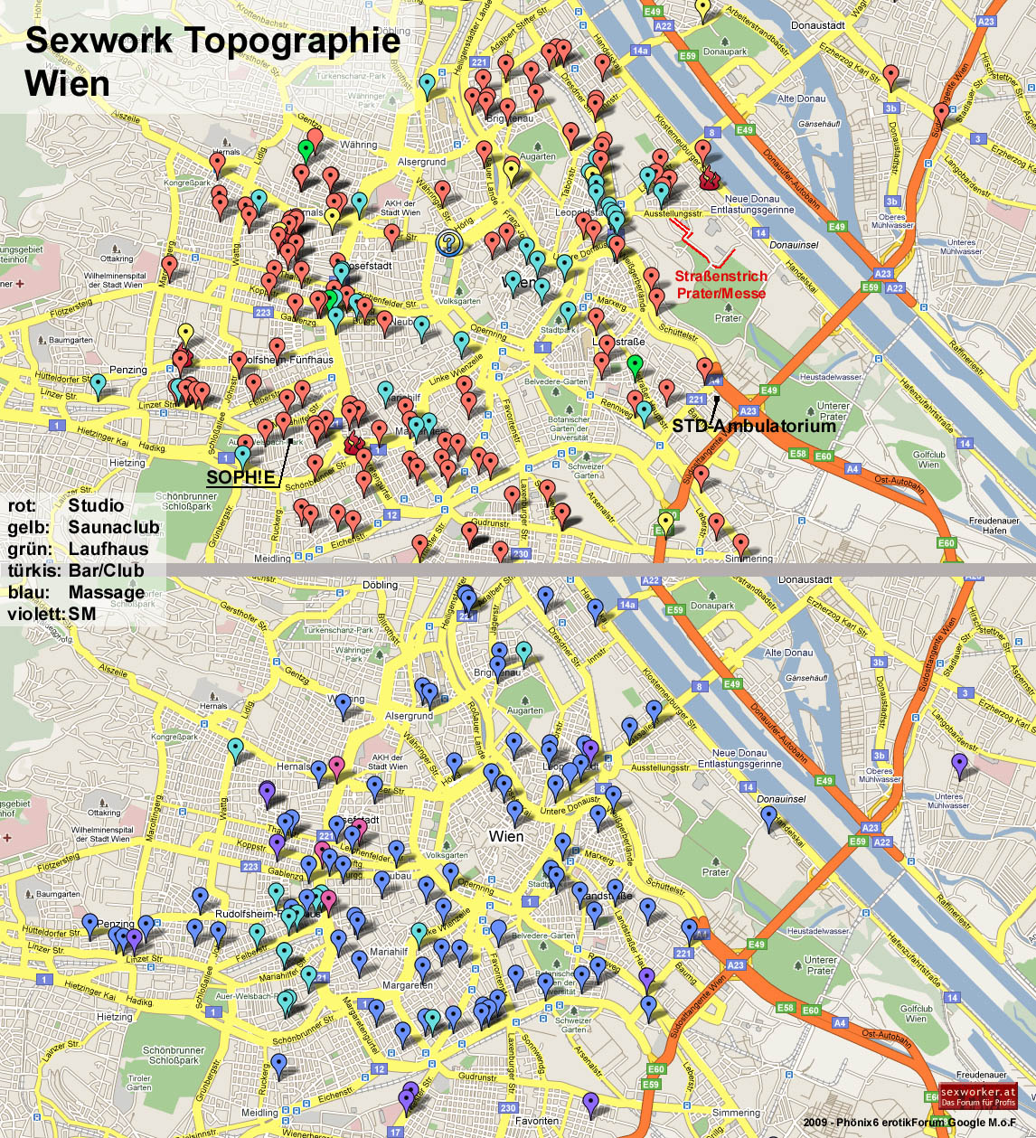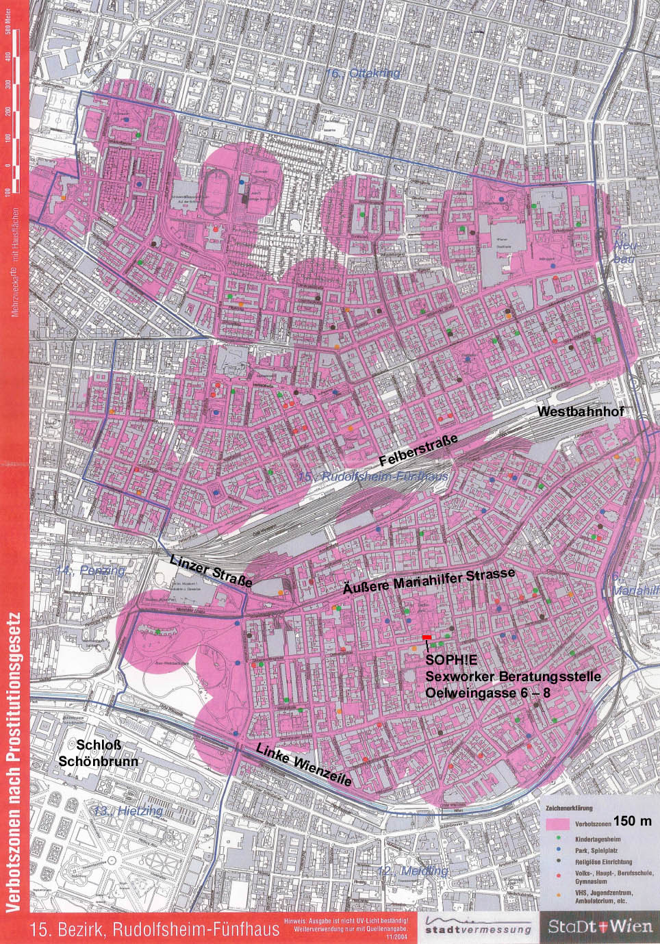 Prostitution ist in Wien nur als Strassenprostitution und in Räumen erlaubt, die einen unmittelbaren und gesonderten Zugang von der Strasse haben. Aber auch dann darf die Prostitution in Bahnhöfen, Stationsgebäuden und Haltestellenbereichen öffentlicher Verkehrsmittel sowie im Umkreis von 150 Metern von Gebäuden und Gebäudeteilen, die religiösen Zwecken gewidmet sind, von Kindertagesheimen, Schulen und Schülerheimen, von Jugendheimen und Jugendzentren, von Kinder- und Jugendspielplätzen, von Krankenhäusern und Pflegeheimen sowie von Friedhöfen weder angebahnt noch ausgeübt werden.