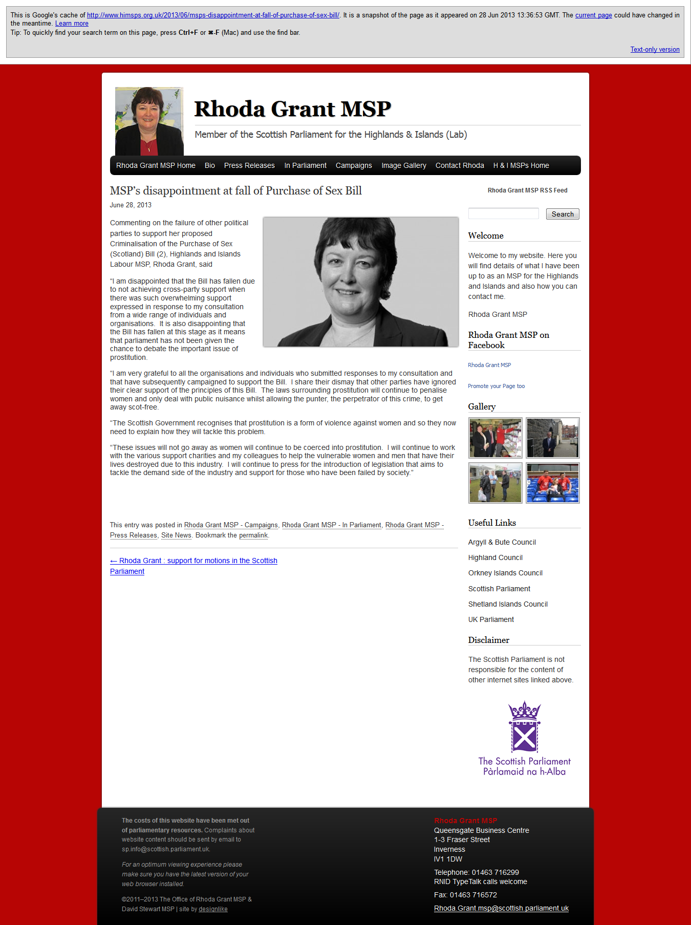 Inzwischen gelöschte Stellungnahme von Rhoda Grant zum Scheitern ihrer Initiative zur Kriminalisierung des Erwerbs von sexuellen Dienstleistungen.<br />Quelle: Google Cache