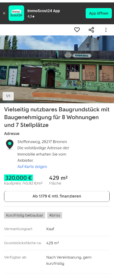 Der Kauf der insgesamt 429 m² großen Fläche ist an keinen Bauträger gebunden und derzeit liegt kein Bebauungsplan vor. Laut Angaben des Maklers existiert außerdem eine genehmigte Planung eines Architekten für ein Wohngebäude mit acht Einheiten und einer Bruttogrundfläche von 965 Quadratmetern sowie sieben Stellplätzen.