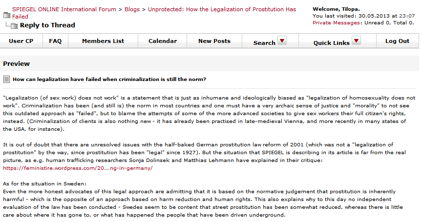 Tilopa hat geschrieben: Möchte mal jemand den Link im Spiegel-Forum posten und entsprechend als "profound critique by human trafficking researchers Sonja Dolinsek and Matthias Lehmann" vorstellen, o.Ä.?