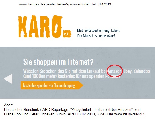 KARO erhält Spenden, wenn Amazon Profite mit unsäglichen Arbeitsbedingungen macht und in D kaum Steuern abführt...
