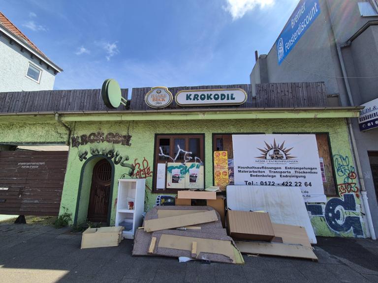 Mit dem "Krokodil" steht auch ein Stück Bremer Geschichte zum Verkauf. Die ehemalige Vergnügungsbar wird derzeit auf dem Portal "immobilienscout24.de" für insgesamt 320.000 Euro angeboten. Das grüne Gebäude mit der verblassten Haake Beck-Leuchtreklame ist inzwischen voller Graffitis, die Fenster sind mit Brettern vernagelt.